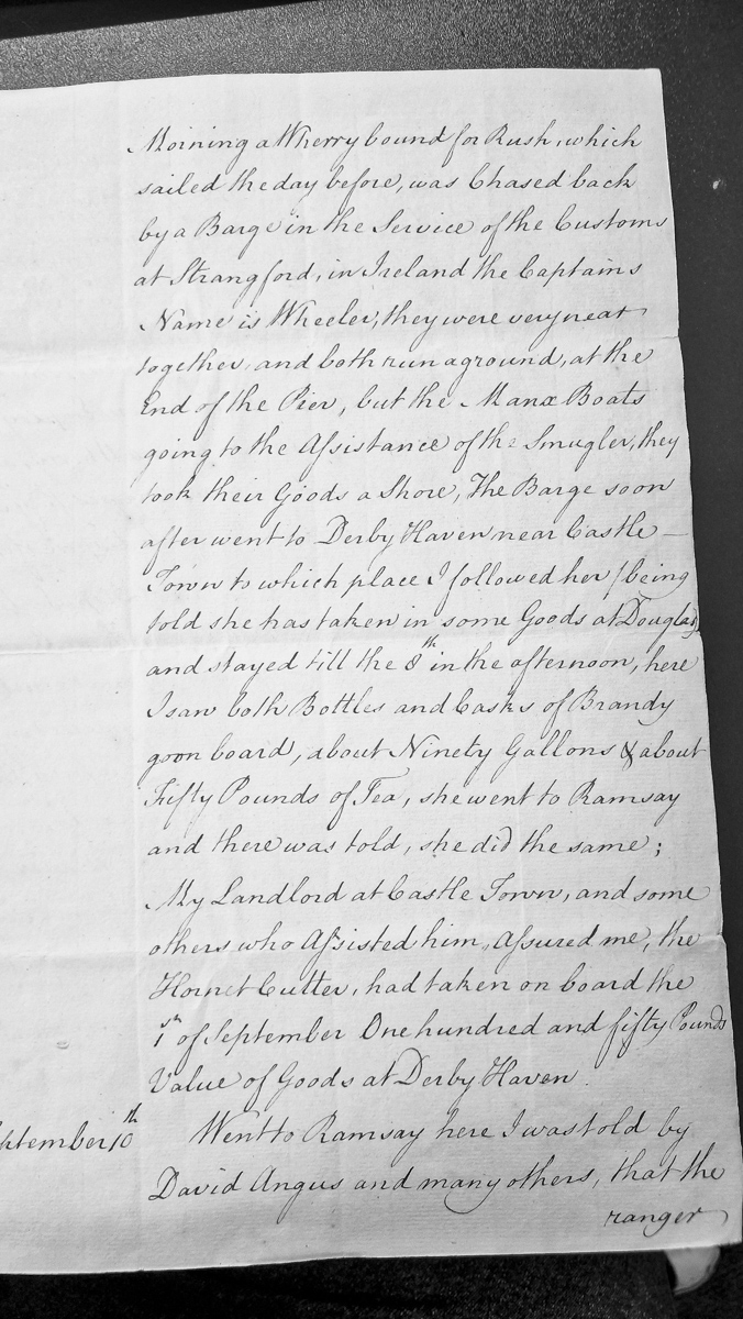 - An administrative report detailing observations of smuggling operations involving vessels, customs enforcement, and contraband goods (brandy and tea) in Manx waters. The document references a wherry chased by a customs barge, goods brought ashore, and involvement of the Hornet Cutter in September, suggesting active monitoring of illicit trade.