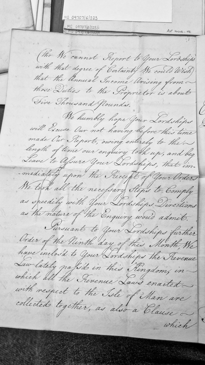 - A formal report to Your Lordships regarding duties income in the Isle of Man, estimated at approximately five thousand pounds annually. The document acknowledges delays in reporting due to the length of enquiry and references the transmission of compiled Revenue Laws for the kingdom.