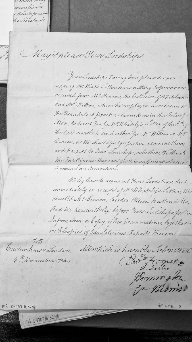 - A letter from Customhouse London officials to their Lordships reporting on their examination of Mr. Willson regarding fraudulent practices occurring in the Isle of Man. The officials relay that they have obtained and are submitting a copy of Willson's examination and their solicitors' reports, as directed by Mr. Whately's letter of the previous month.