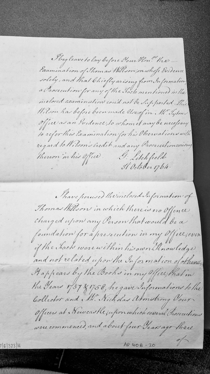 - A legal opinion concerning an information submitted by Thomas Wilson. The writer reviews the document and concludes there is insufficient basis for prosecution in their office, even if the facts were within Wilson's personal knowledge. References are made to Wilson's previous informations from 1757-1758 that resulted in prosecutions at Newcastle.