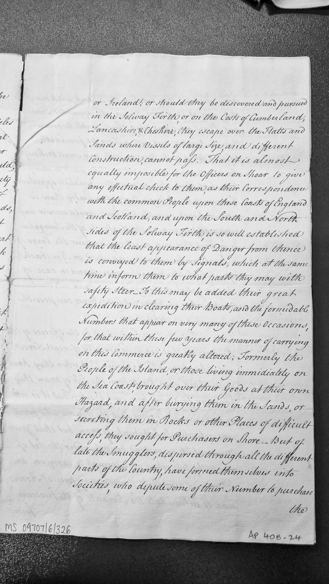 - This is an excerpt from a longer administrative document discussing smuggling activities in the Irish Sea and along the coasts of England, Scotland, and the Isle of Man. The text describes the methods used by smugglers, their organized networks, and the challenges faced by shore officers in intercepting contraband operations. It notes the shift from individual smuggling efforts to organized societies operating across the country.
