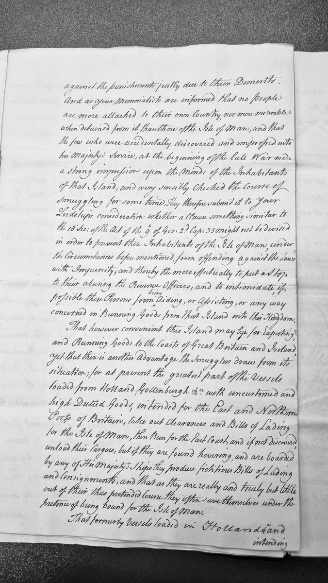 - A petition addressing smuggling operations involving the Isle of Man and requesting legislative measures to prevent inhabitants from offending against revenue laws. It discusses the use of false bills of lading and clearances by smuggling vessels, and proposes a clause similar to the 18th Section of the 9th year of George II's Act to deter smuggling and intimidate those assisting in running goods.