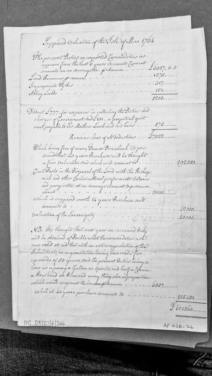 - A financial assessment of the Isle of Man's revenue sources and property valuations dated 1764. The document calculates annual revenues from duties, land, tythes and abbey lands, deducts administrative costs, and applies multiplier factors (40 and 14 years purchase) to estimate total valuation of approximately £620,360. It includes a note on anticipated duty increases.