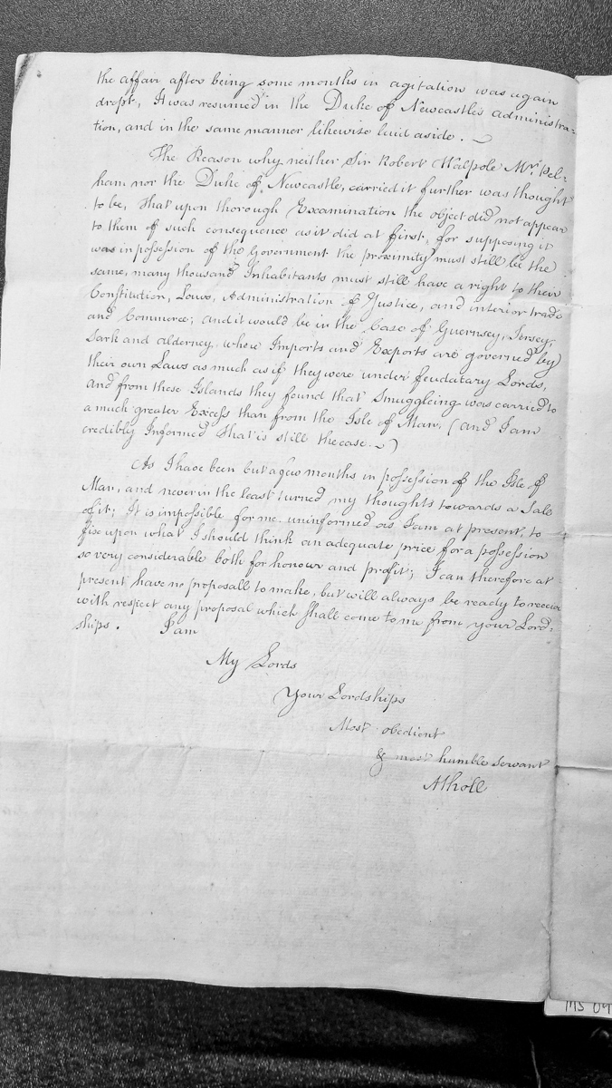 - Fragment of correspondence discussing the history of government attempts to acquire the Isle of Man during the administrations of Sir Robert Walpole, Henry Pelham, and the Duke of Newcastle. The writer (the Duke of Athol, current possessor) declines to propose a sale price but expresses willingness to receive offers, noting the island's considerable value for both honour and profit.