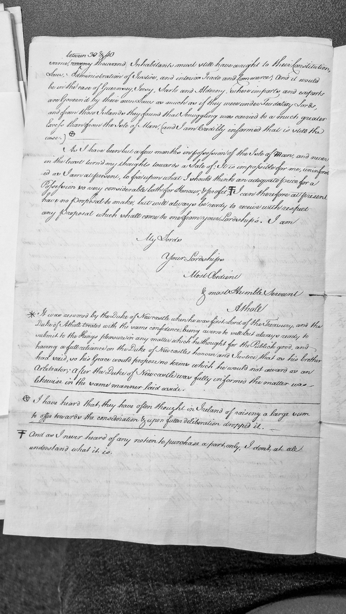 - A letter from the Duke of Athole responding to a proposal regarding the sale or disposition of the Isle of Man. The Duke discusses his recent acquisition of the island, his reluctance to sell without adequate valuation, and compares the Isle of Man's governance and smuggling issues to other Channel Islands. The letter includes footnotes addressing prior negotiations with the Duke of Newcastle.