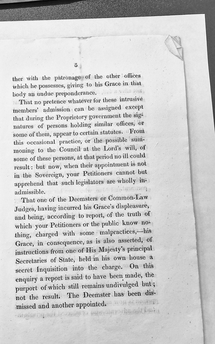 - A petition protesting the admission of certain office-holders to the House of Keys or governing council, arguing their appointment lacks proper sovereign authority. The petition also criticises a secret inquisition conducted by the Governor into charges against a Deemster (judge), resulting in dismissal without public disclosure of findings.