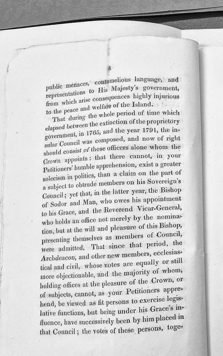 - A petition addressing concerns about the composition of the insular Council, particularly objecting to the admission of ecclesiastical members (Bishop, Vicar-General, Archdeacon) appointed through the Duke of Atholl's influence rather than direct Crown appointment. The petitioners argue this constitutes a breach of proper governance principles established after 1765.