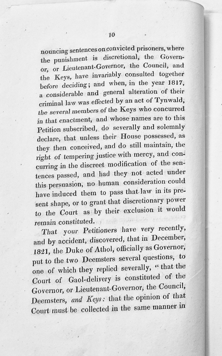 - A petition from members of the House of Keys asserting their historical right to participate in tempering justice and modifying sentences in criminal cases. The petition references a 1817 criminal law reform and disputes the interpretation of the Court of Gaol-delivery's composition following questions posed by the Duke of Athol in December 1821.