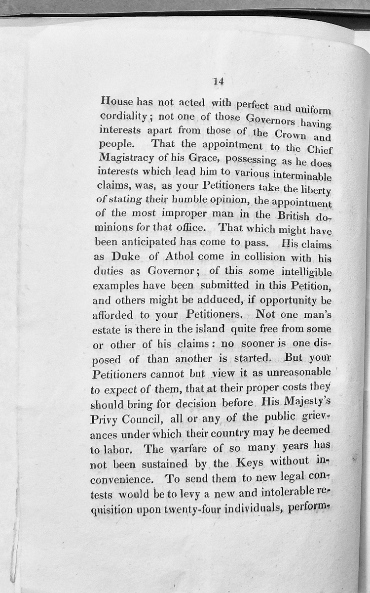 - A petition from representatives of the Isle of Man (likely the House of Keys) objecting to the appointment of the Duke of Athol as Chief Magistrate/Governor. The document argues that his private interests as Duke conflict with his public duties, creating disputes over land claims across the island and imposing financial burdens on the petitioners to resolve grievances.