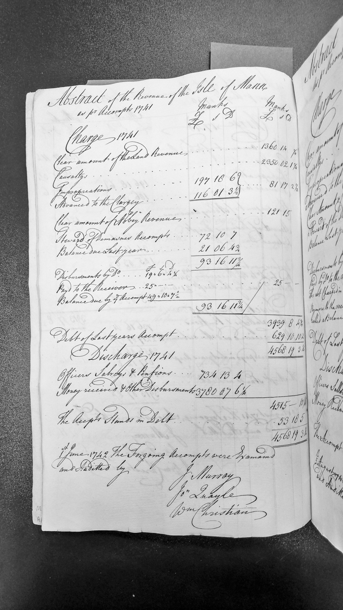 - A financial accounting document detailing debts, discharges, officer salaries and disbursements for 1741, with a balance calculation. The account was examined and audited on 1 June 1742 by three auditors.