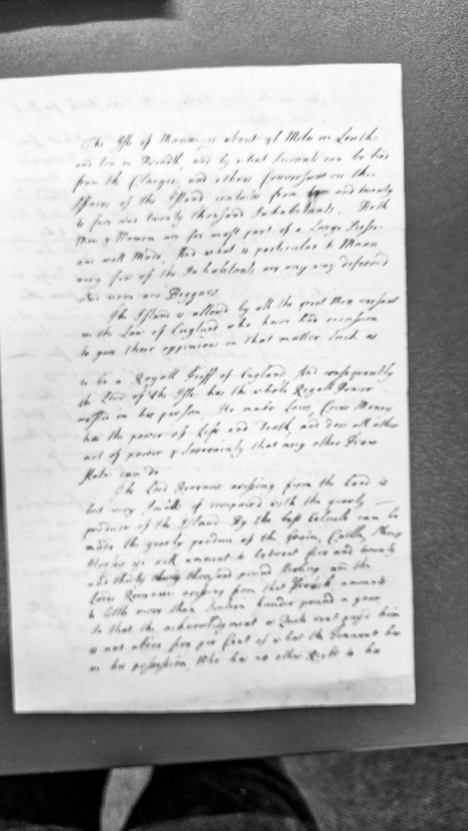 - A descriptive account of the Isle of Man covering its dimensions (31 miles long, 10 miles broad), population estimates (24,000 inhabitants), physical characteristics of inhabitants, and its legal status as a Royal Feoff of England. The document discusses the Lord's regalia power and analyzes the island's economic productivity and revenue structure.