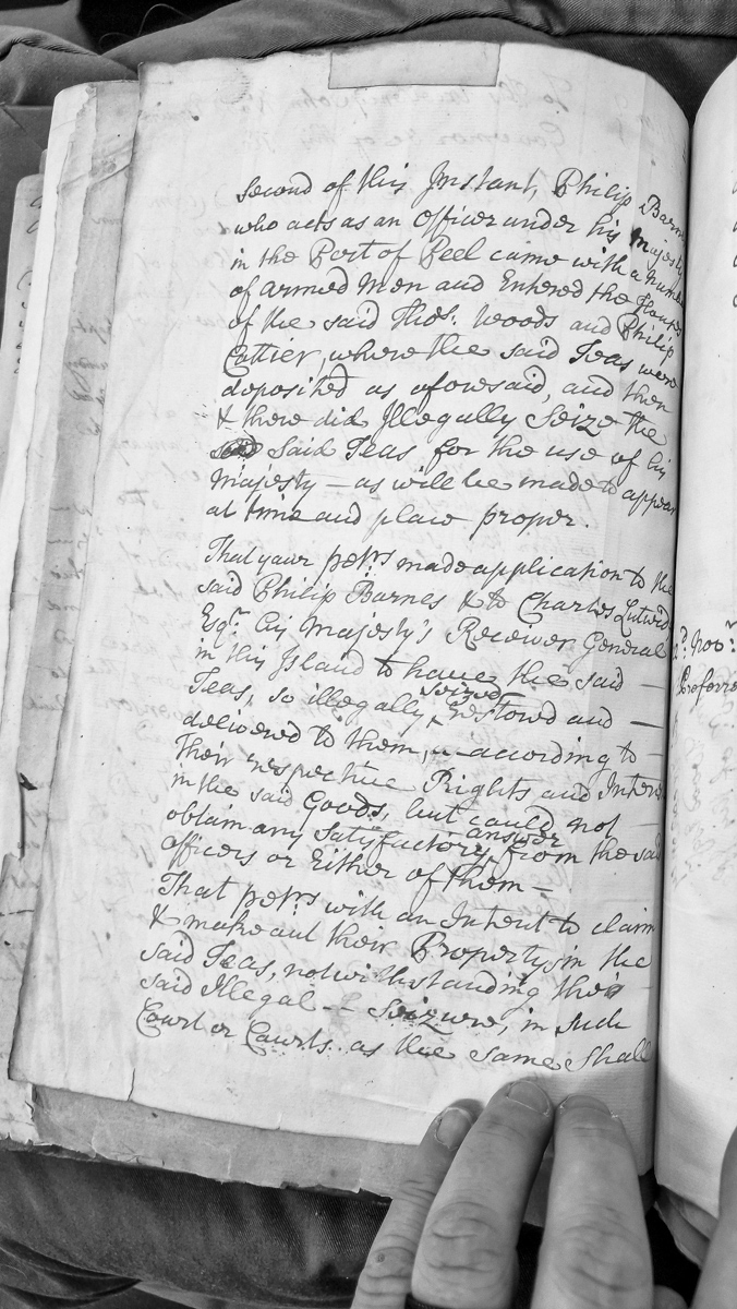 - A petition describing the illegal seizure of tea by Philip Barnes, an officer acting under His Majesty in the Port of Peel, and armed men who entered the houses of Thomas Woods and Philip Cottier. The petitioners sought return of the goods but received no satisfactory answer from the officers and intend to claim their property rights in court.