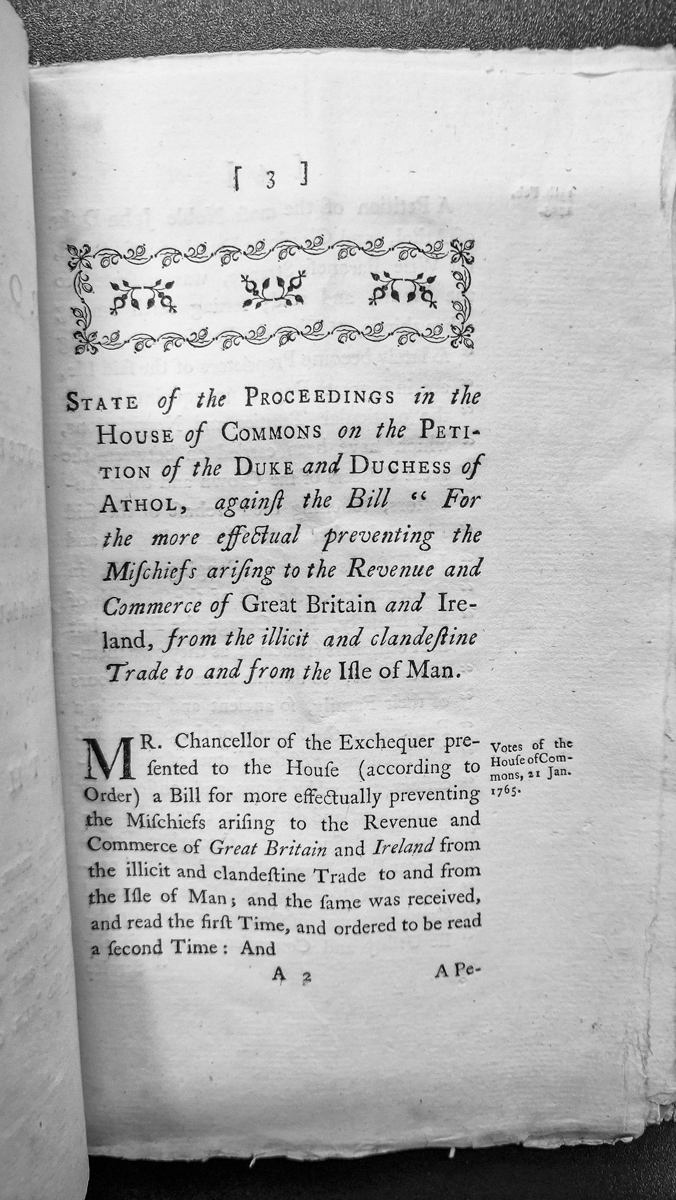 - A printed record of proceedings in the House of Commons concerning a petition by the Duke and Duchess of Athol against a bill designed to prevent illicit trade to and from the Isle of Man. The Chancellor of the Exchequer presented the bill on 21 January 1765, which aimed to protect the revenue and commerce of Great Britain and Ireland.
