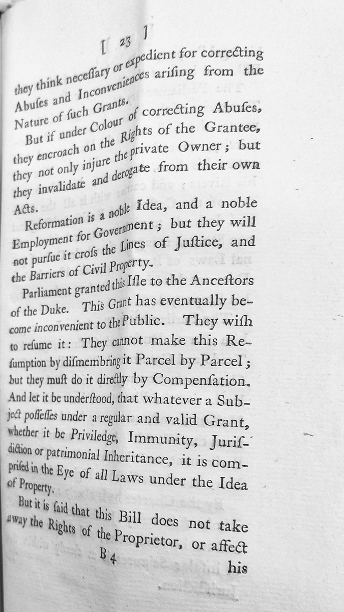 - A legal opinion arguing that while Parliament may reform abuses arising from grants, it cannot encroach on the rights of grantees without compensation. The text discusses Parliament's grant of the Isle of Man to the Duke's ancestors and argues that any resumption of such grants must be done through direct compensation rather than piecemeal dismemberment, as property rights are protected under law.