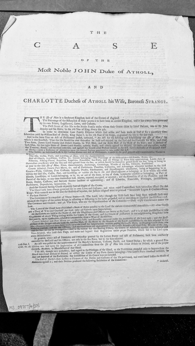 - The Case of John Duke of Atholl and Charlotte Duchess of Atholl concerning Isle of Man sovereignty and rights