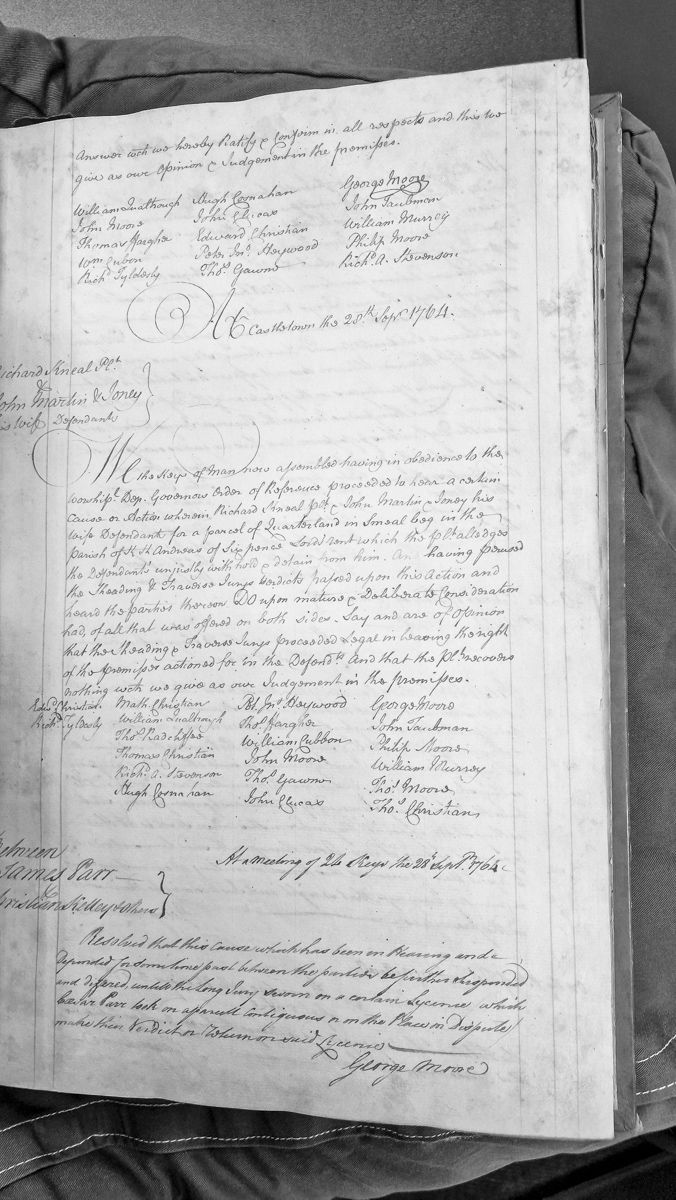 - A House of Keys judgment dated 20 September 1764 concerning a dispute over a parcel of quarterland in Kneal beg, Kirk Andreas parish, with six pence lord rent. The Keys upheld the verdict of the Sheading and Traverse Juries in favour of the defendants, denying the plaintiff's claim. The document also includes a subsequent resolution from 28 September 1764 to suspend another case between James Parr and Christian Kelley pending a jury verdict on a disputed licence.
