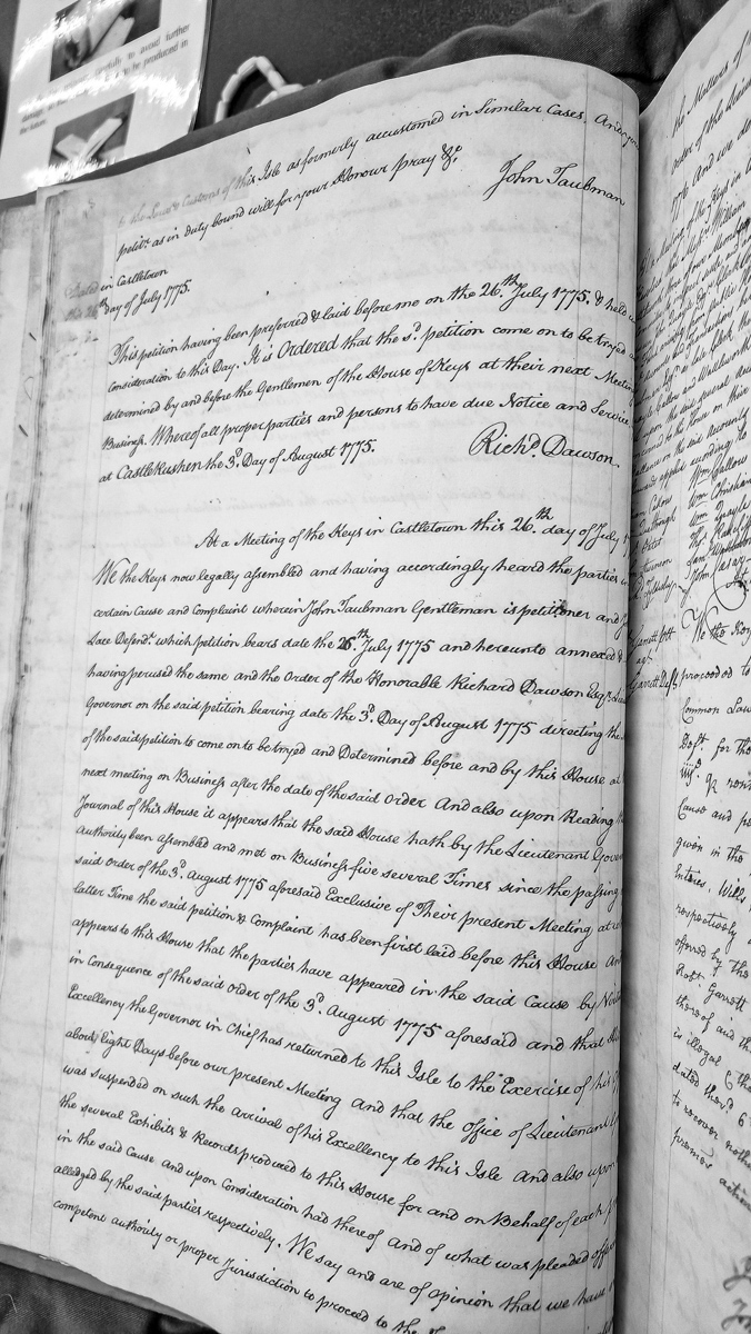 - A House of Keys proceeding documenting a petition by John Taubman (Gentleman) against a defendant named Lace. The document includes the original petition dated 26 July 1775, an order by Governor Richard Dawson dated 3 August 1775 directing the matter to the House of Keys, and the Keys' assembled response indicating consideration of the case and jurisdictional questions.