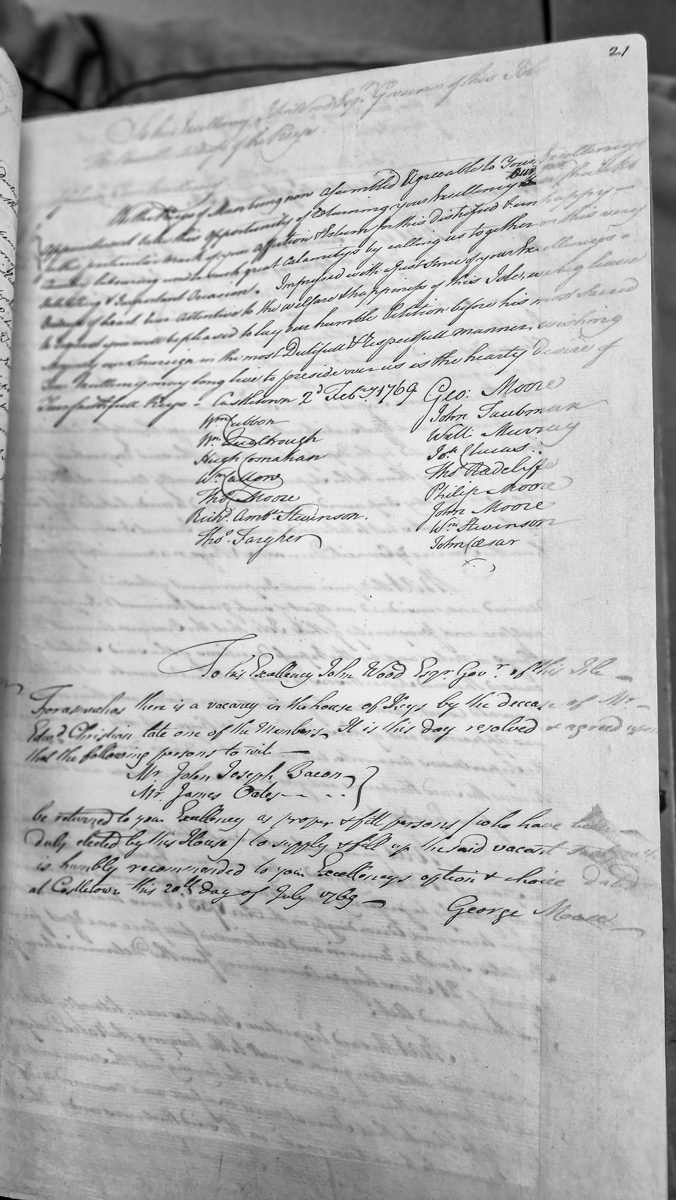 - A formal resolution from the House of Keys to Governor John Wood Esq, dated 20 July 1769, recommending two candidates, John Joseph Bacon and James Oates, to fill a vacancy created by the death of Ewan Christian. The document requests the Governor's approval of the elected candidates.