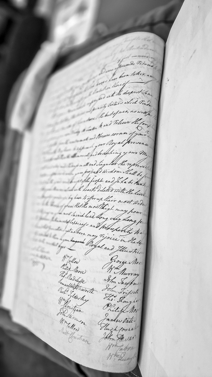 - A fragmentary loyal address, likely from the House of Keys to the reigning monarch, expressing devotion and seeking royal guidance. The document conveys the representatives' deep concern for the welfare of the Isle of Man and its people, with prayers for the monarch's long life and prosperity. Significant portions are obscured due to photography angle and document damage.
