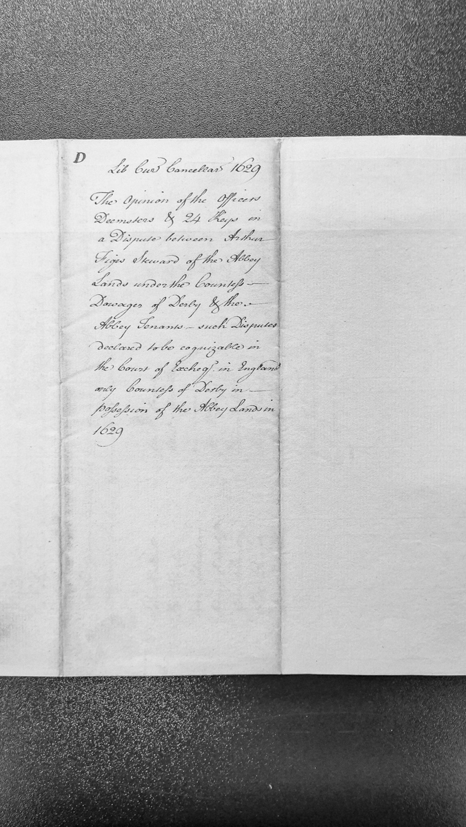 - A legal opinion from the Deemsters and House of Keys regarding a dispute between Arthur Figes (Steward of Abbey Lands under the Countess-Dowager of Derby) and the Abbey Tenants. The opinion determines that such disputes are cognizable only in the Court of the Exchequer in England, and notes the Countess of Derby's possession of the Abbey Lands in 1629.