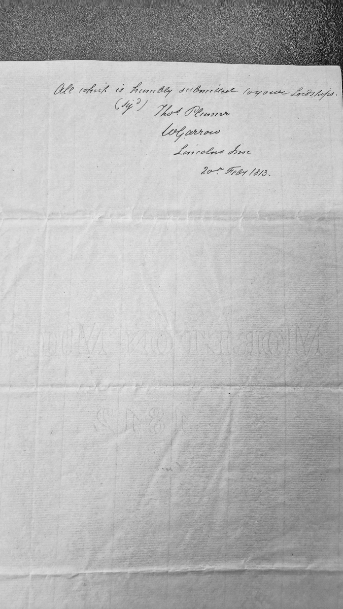 - A legal document submitted to the House of Lords, signed by Thomas Plumer and W Garrow from Lincoln's Inn on 20th February 1813. The fragment represents the concluding submission of a legal opinion or petition.