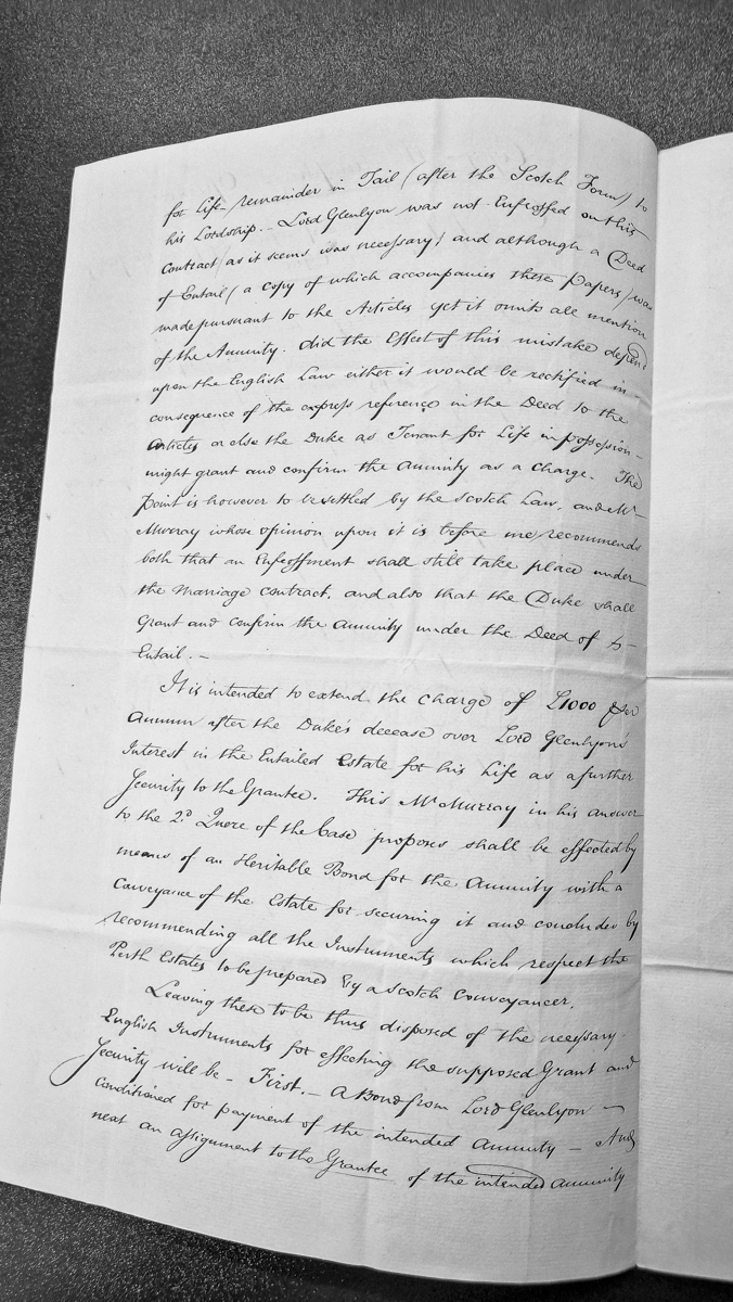 - A legal opinion addressing the settlement of an annuity under a marriage contract involving Lord Glenlyon and the Duke. The document discusses issues with a Deed of Entail that omits mention of an annuity, recommends infeftment procedures under Scottish law, and outlines necessary English legal instruments for securing the annuity payment.