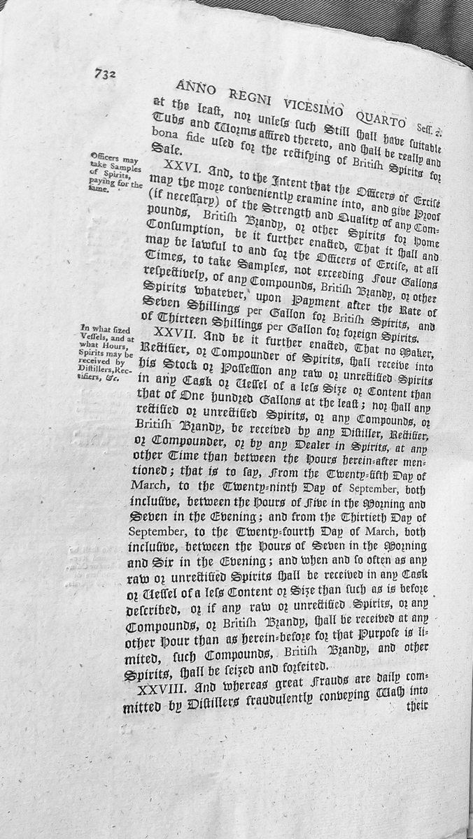 - Extract from a printed statutory document outlining excise regulations for the manufacture and handling of spirits in Britain. Details provisions regarding still equipment, sampling procedures for excise officers, vessel sizes for receiving spirits, and hours of operation for distillers and rectifiers.