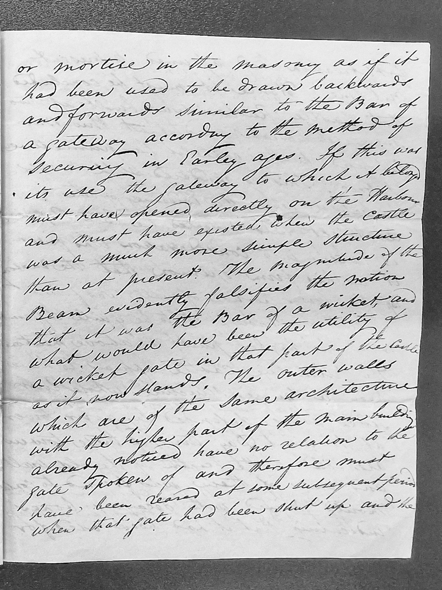 - A fragmentary text discussing the architectural history of a castle structure, specifically analyzing the purpose and design of a large beam or bar that may have functioned as a gateway mechanism. The author considers whether it served as a sliding bar for security purposes in early construction phases.