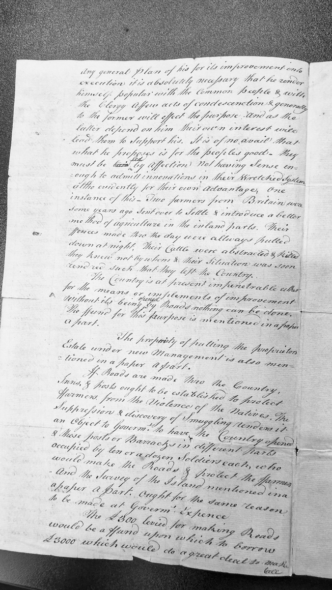 - Fragment of a longer administrative document containing proposals for the improvement of the Isle of Man. The author discusses the necessity of gaining popular support for reforms, describes resistance to agricultural innovation, and outlines infrastructure and security measures including road-building, establishment of inns and posts, suppression of smuggling, and placement of soldiers for protection and road maintenance.