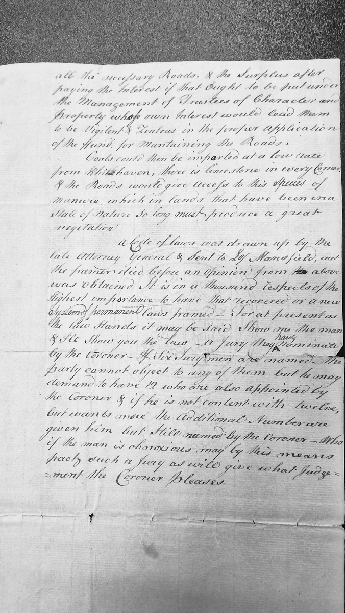 - Fragment of a legal opinion discussing proposed improvements to roads and infrastructure on the Isle of Man, including coal imports from Whitehaven and lime-based fertilizer distribution. The document critiques the current legal system, particularly jury selection procedures dominated by the Coroner, and references a code of laws previously sent to Lord Mansfield by a deceased Attorney General.