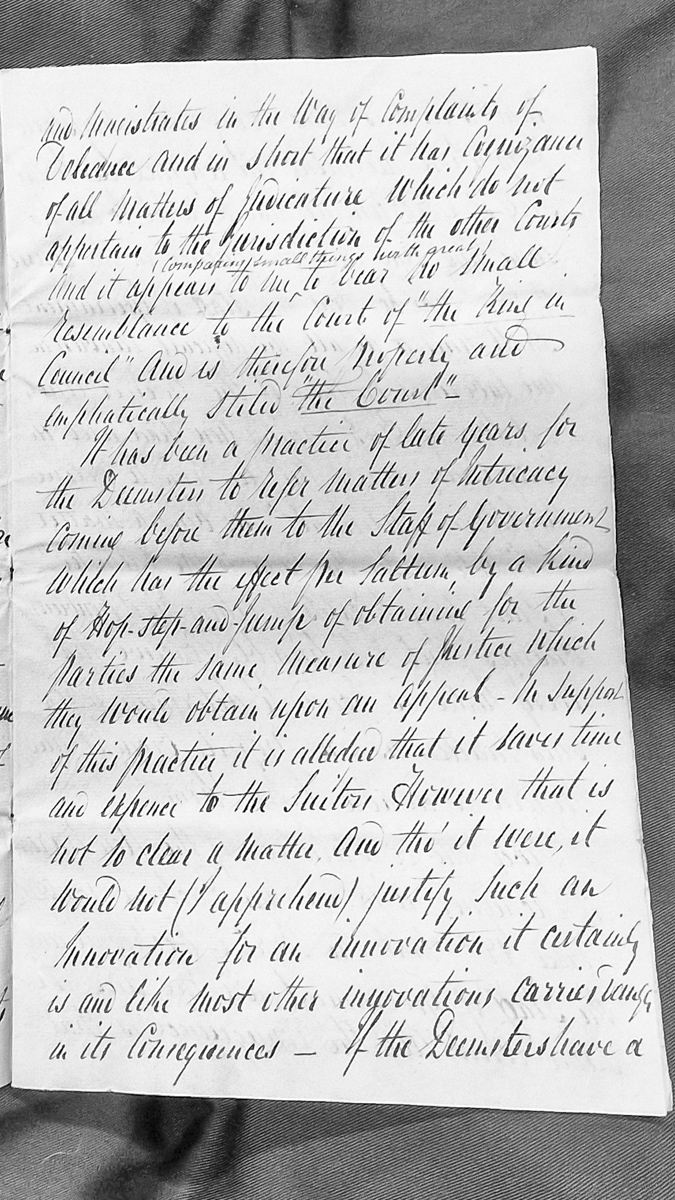 - A fragment of a legal opinion discussing the jurisdiction and structure of the Island's courts, particularly the Council court and its resemblance to the Court of the King in Council. The author critiques a recent practice of Deemsters referring complex matters to the Staff of Government as an irregular innovation that bypasses proper appeal procedures.