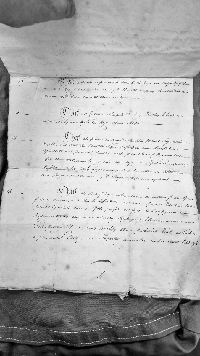 - Page numbered 4 at bottom. Text shows strikethrough editing ('and' crossed out in clause 15). Some words use historical spelling conventions (e.g. 'neceſsary', 'poſseſs', 'diſsolved', 'Redreſs').