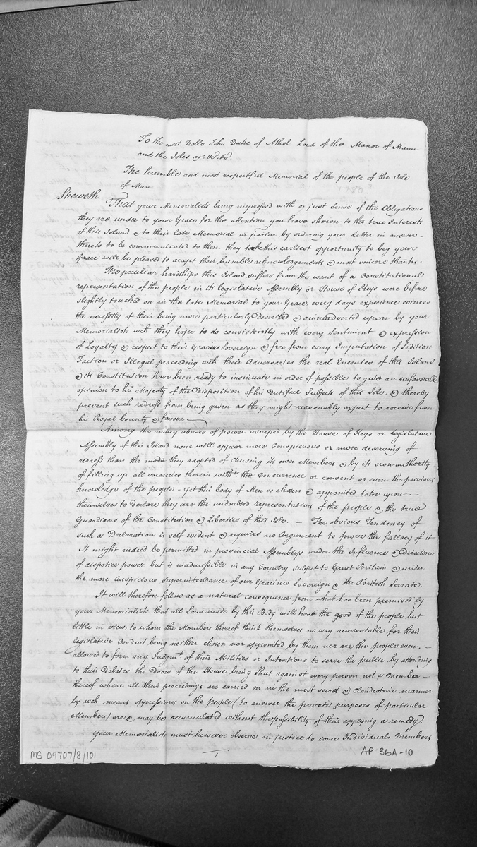 - Memorial of the people of Isle of Man to the Duke of Athol regarding legislative representation