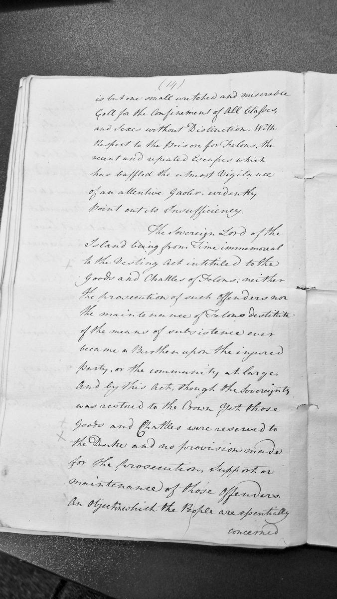 - This document discusses the inadequate state of prison facilities on the Isle of Man, particularly regarding confinement of felons and the problems of escapes. It examines the legal and financial implications of the Vesting Act regarding the Crown's sovereignty, the Duke's retained rights to felons' goods, and the unresolved question of who bears responsibility for prosecuting and maintaining offenders.
