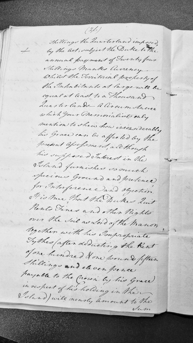 - This is a fragment from a memorial or petition addressing the Duke's financial obligations and territorial interests on the Isle of Man. The document discusses quarterland assessments, annual payment obligations in Manks Currency, and the Duke's various property rights including quit rents, fines, impropriate tythes, and his position as Lord of the Manor.