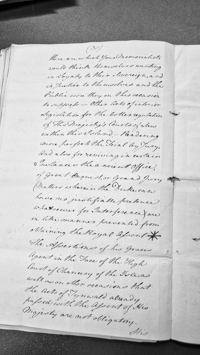 - This is an excerpt from a memorial or petition addressing concerns about the suppression of legislative acts by what appears to be the Duke of Atholl. The document discusses acts relating to the regulation of courts of law, trial by jury, and revival of the Grand Jury office, asserting that the Duke has no legitimate grounds to prevent these acts from obtaining Royal Assent.