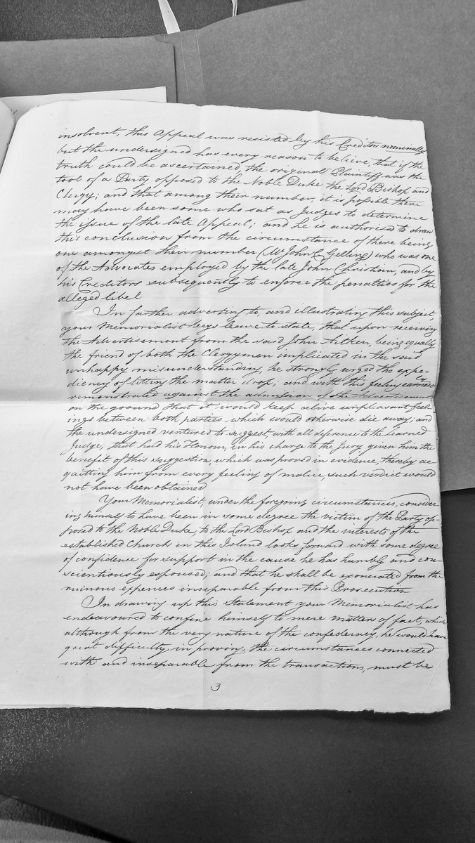 - A petition or memorial addressing alleged procedural irregularities and bias in a libel case. The memorialist claims the original plaintiff was a tool of parties opposed to the Duke, Bishop, and Clergy, and alleges that one of the judges (John C Gelling) had prior involvement with the opposing party. The memorial requests exoneration and financial support regarding prosecution expenses.