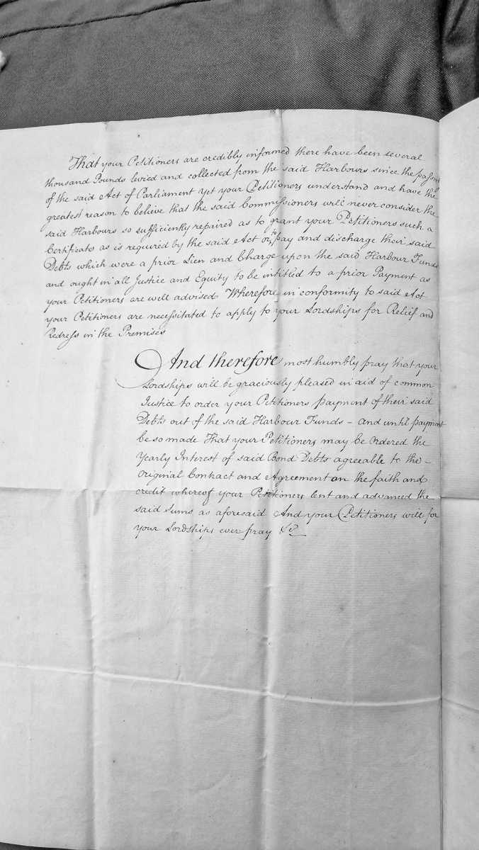 - A petition seeking relief from unidentified petitioners regarding debts owed from harbour funds. The petitioners claim that several thousand pounds have been collected from harbours under an Act of Parliament, but commissioners refuse to grant certificates or discharge prior debts. The petitioners request payment of their bond debts from harbour funds plus yearly interest.