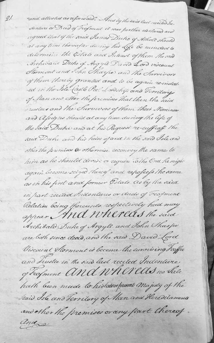 - A legal document concerning a Deed of Feofment involving James Duke of Atholl and trustees (Archibald Duke of Argyle, David Lord Viscount Stormont, and John Sharpe) regarding the Isle of Man, its Castle, Peel, Lordships and Territory. The document details conditions for re-enfeoffment and reconveyance of the estate.