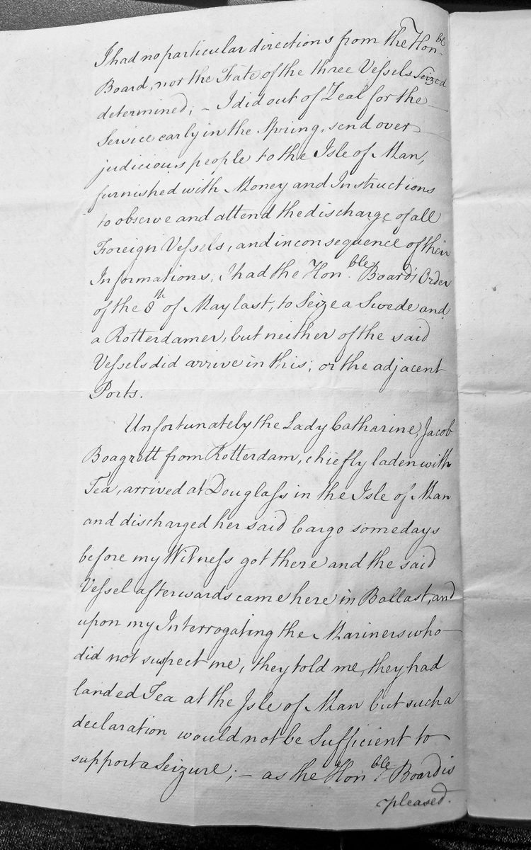 An official report detailing efforts to seize foreign vessels engaged in smuggling tea to the Isle of Man. The author describes sending observers to monitor foreign vessel discharges and reports on the attempted seizure of a Swedish and Rotterdam vessel, as well as the Lady Catharine which discharged tea at Douglas before the witness arrived.