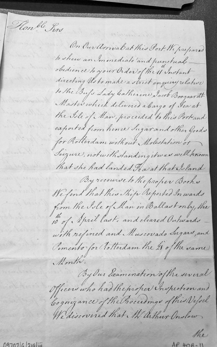 - Official correspondence reporting on an inquiry into the ship Buss Lady Catherine, commanded by Jacob Boogaardt, which delivered tea to the Isle of Man and subsequently exported sugar and goods from port without seizure despite known tea landing. The document references official records and officer examinations.