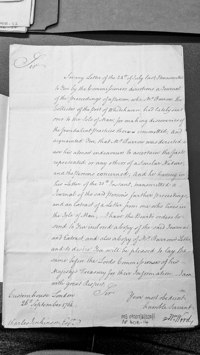 Official letter from William Wood at the Customhouse, London, to Charles Jenkinson Esq., transmitting copies of a journal documenting investigations into fraudulent customs practices on the Isle of Man, along with related correspondence from Mr. Burrow, Collector of the Port of Whitehaven, for submission to the Lords Commissioners of the Treasury.