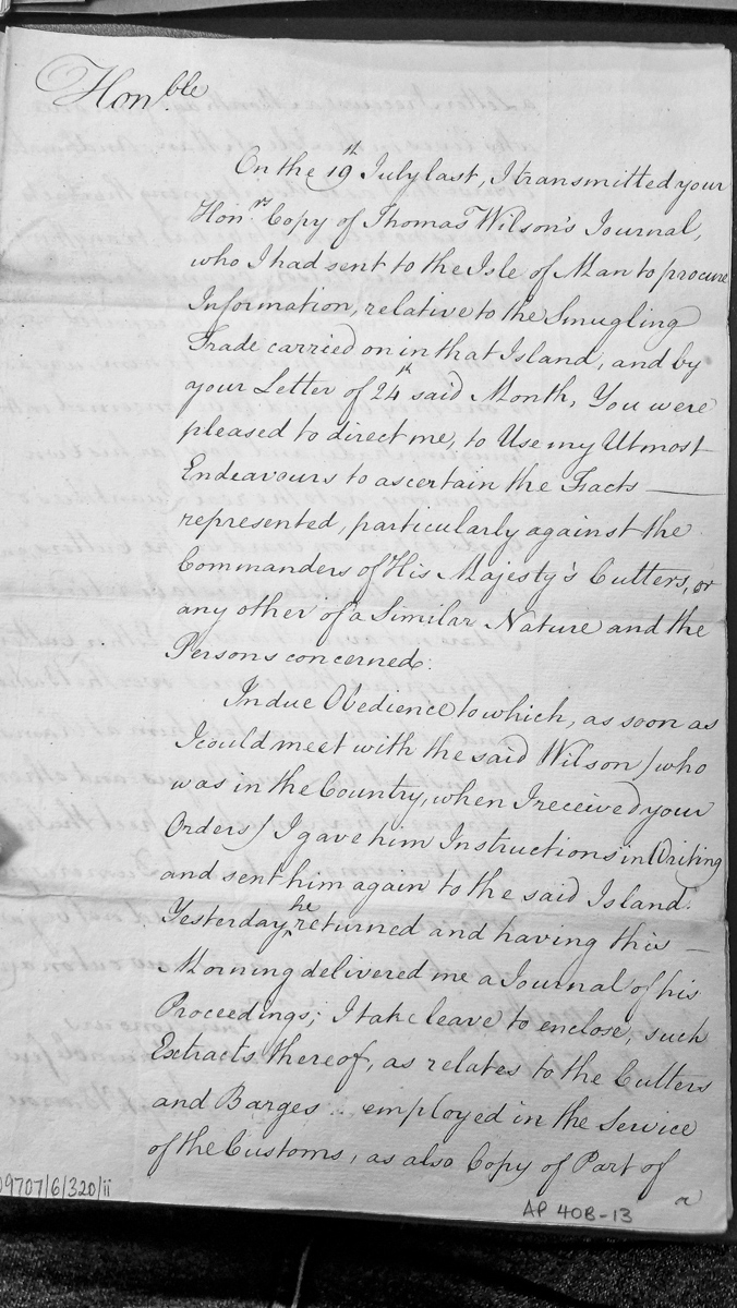 Administrative letter enclosing extracts from Thomas Wilson's investigative journal concerning smuggling activities in the Isle of Man and the conduct of His Majesty's Customs cutters and barges. The sender reports having received instructions on 24th July to investigate facts represented against commanders of royal vessels and persons involved in smuggling operations.