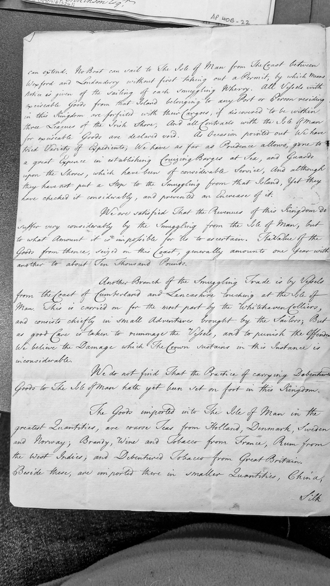 An administrative report detailing smuggling activities from the Isle of Man to Ireland and the British coast, describing enforcement measures including permits, coastal guards, and cruising barges. The report estimates annual seized goods valued at approximately ten thousand pounds and identifies major smuggled commodities including tea, brandy, wine, tobacco, and rum.