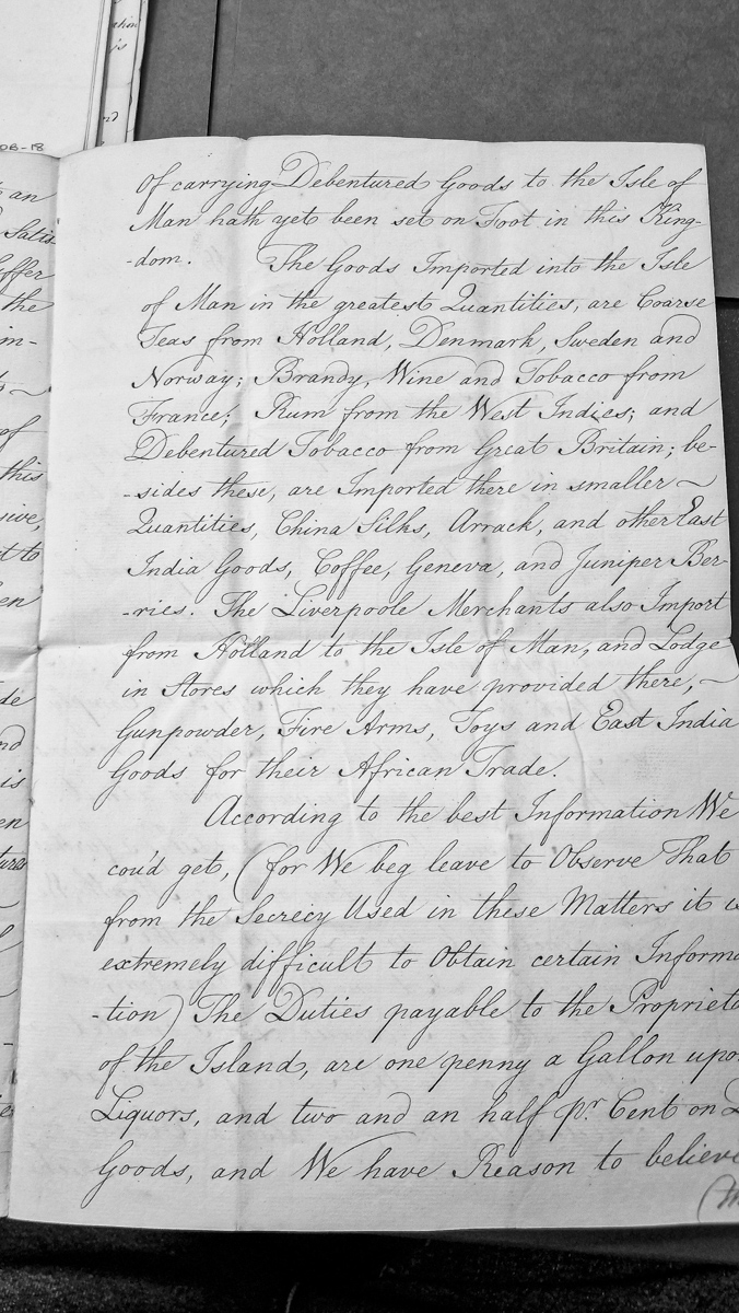An administrative report detailing the types and quantities of goods imported into the Isle of Man, including coarse teas, spirits, tobacco, and East India goods. The document discusses the duties payable to the Island's Proprietor and notes the difficulty in obtaining reliable information due to the secrecy surrounding these trading matters.
