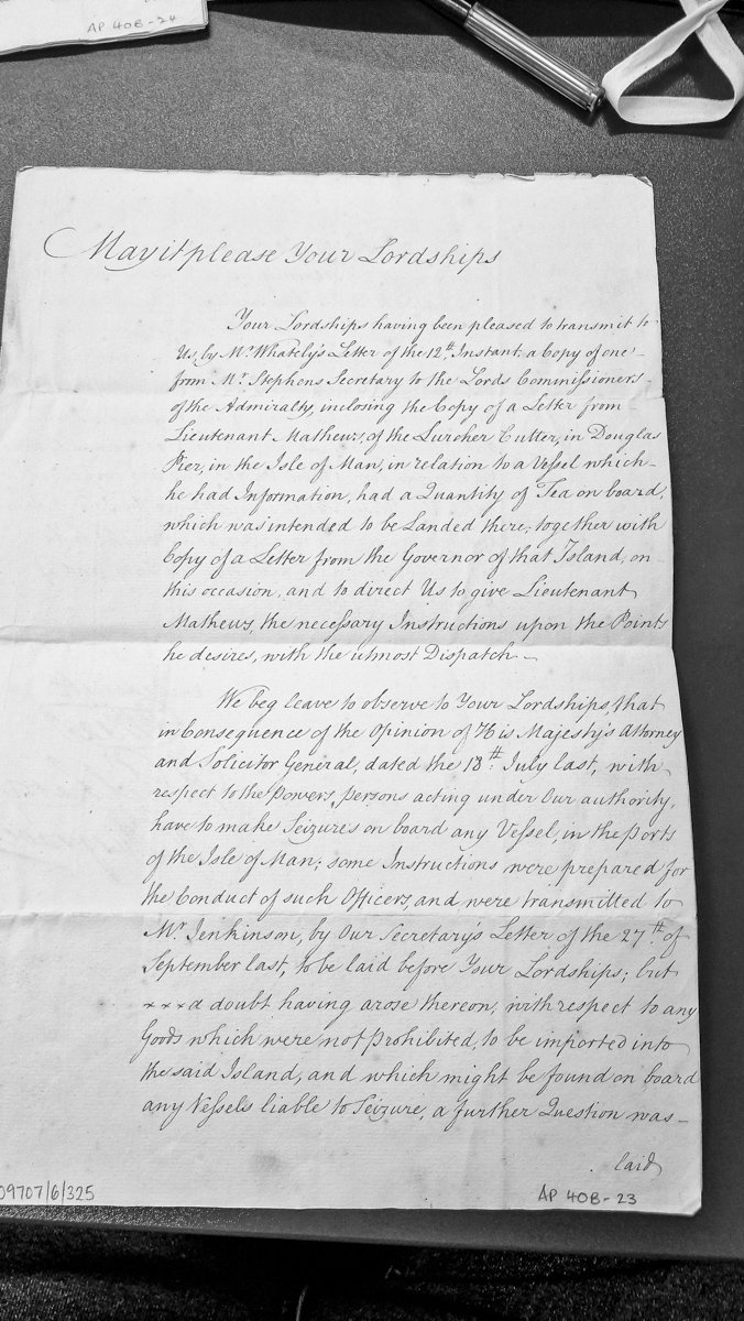 - Official correspondence from revenue authorities to their lordships regarding instructions for Lieutenant Mathews of the Lurcher Cutter concerning seizure powers in Isle of Man ports. References an incident involving a vessel suspected of carrying tea for illegal landing, and discusses legal opinions on seizure authority and procedures.