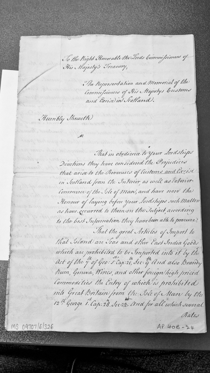 A memorial from the Commissioners of His Majesty's Customs and Excise in Scotland to the Lords Commissioners of the Treasury, detailing the prejudices to revenues arising from the interior and exterior commerce of the Isle of Man. It identifies prohibited imports including East India goods, teas, brandy, rum, and other foreign commodities.