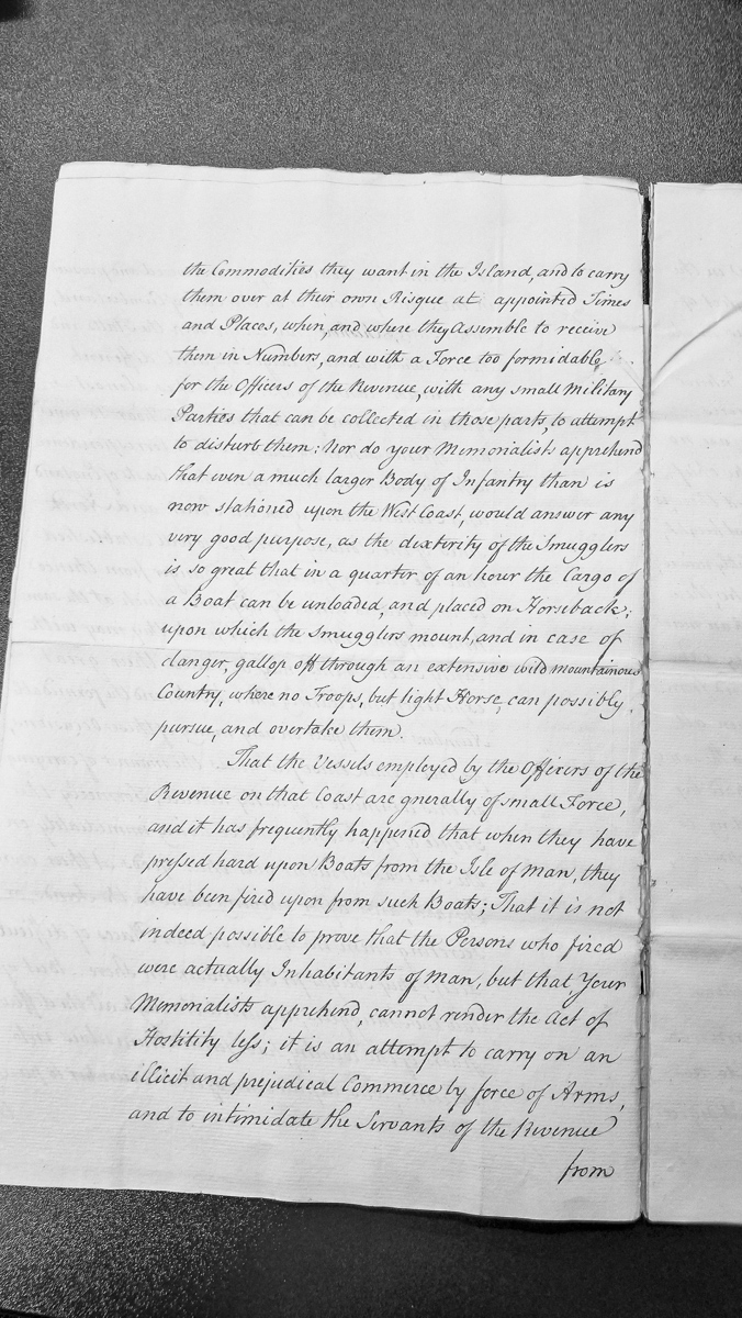 - This document is an excerpt from a petition (memorialists' petition) describing smuggling activities on the Isle of Man, particularly on the west coast. It details the organizational sophistication of smugglers, their ability to rapidly unload cargo and disperse through mountainous terrain on horseback, and incidents of armed resistance to revenue officers. The petitioners argue for stronger enforcement measures.