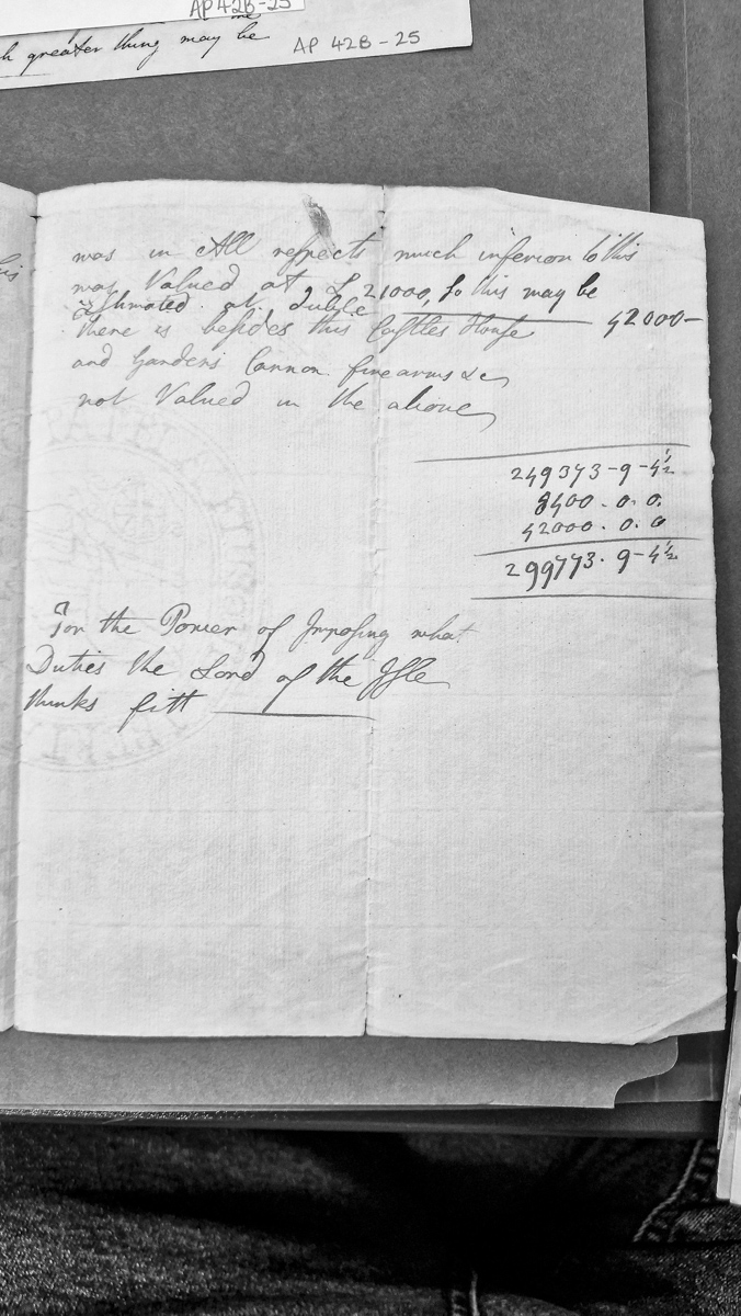A revenue abstract calculating property valuations, including a castle, house, gardens, and military equipment. The document shows comparative valuation methodology and totals approximately £299,773, with a note regarding the Lord of the Isle's power to impose duties as seen fit.