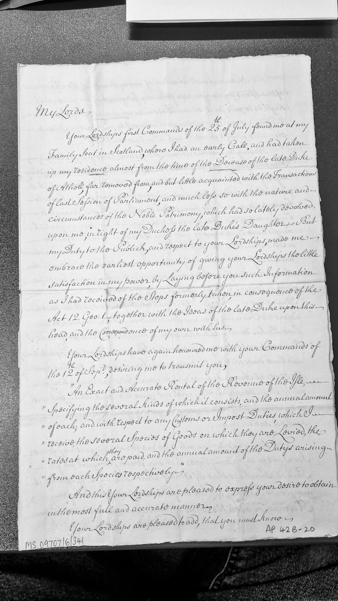 A letter from a nobleman (likely the Duke of Atholl or his successor) responding to commands from the House of Lords dated 25 July and 12 September, regarding the provision of detailed revenue information for the Isle of Man. The writer acknowledges his duties and commits to providing accurate rental and customs data as requested.